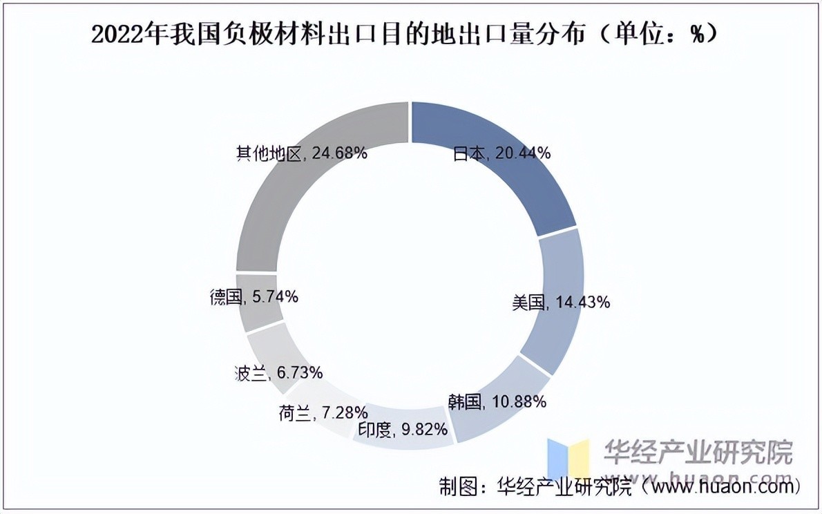 我国负极材料主要出口前往日本、美国、韩国与印度等地,2021年四个地区出口量合计占比55.57%,荷兰、波兰与德国出口量分别占比7.28%、6.73%与5.74%,其他地区出口量占比24.68%。
